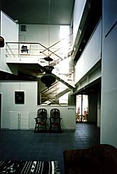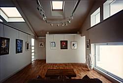 | 安藤岬氏は、「光の教会」内の竹のオブジェでも知られる作家で、絵画、書、陶芸、彫刻、いけばななど、広範な分野で制作活動中である。玉子夫人も、大胆な抽象絵画で知られるが、そんな作家夫婦の大阪でのアトリエである。 場所は、長居公園北側の住宅地の中ほどである。プランは、制作、収蔵、展示に分けられるが、道路側に収蔵を配し、奥の北側二層を制作室とした。ここは、三層の吹き抜けの空間の光を中心にスキップした階を配した。三階部に、内、外の空間でギャラリーをしつらえ、創作とその鑑賞を同時に行える複合がうまくまとまったと考えている。 |