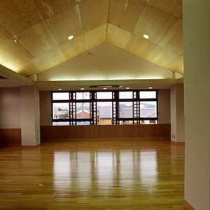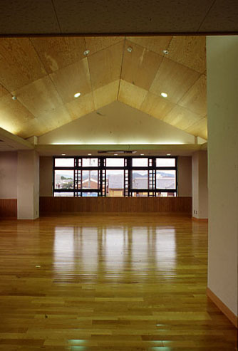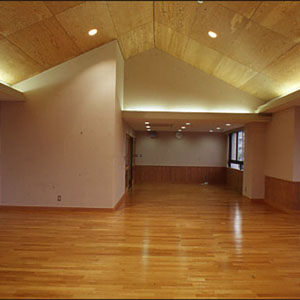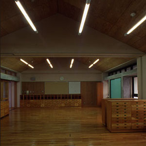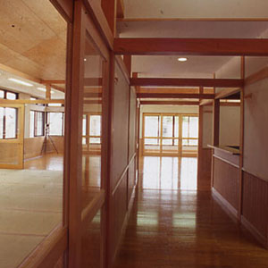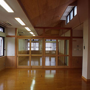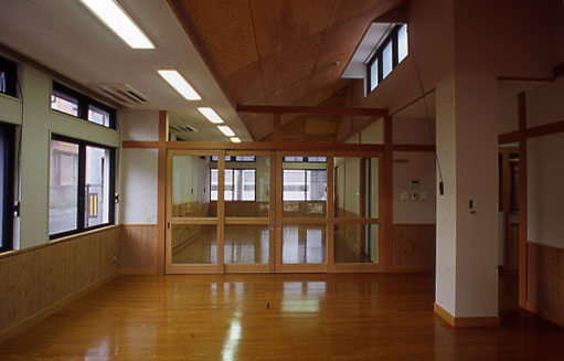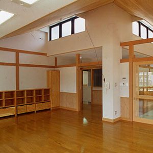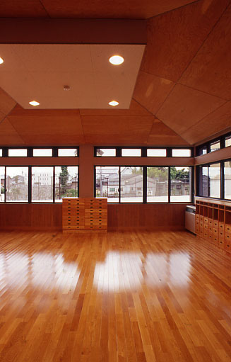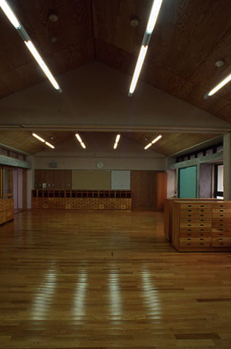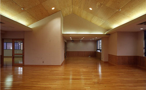 インテリア空間として、床材は主に、ナラ縁甲板t=15ウレタン仕上を基本に用い、天井にカラ松の構造用合板t=9、腰壁に北欧のパイン材を多数使用し、木質感をフィーチャーしている。