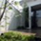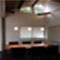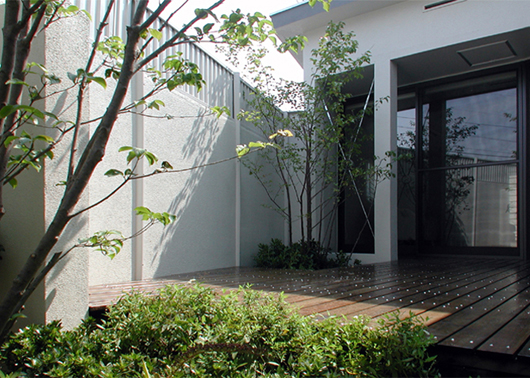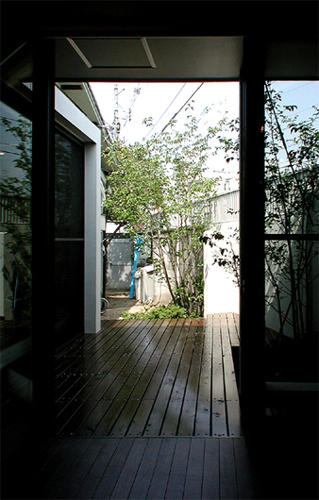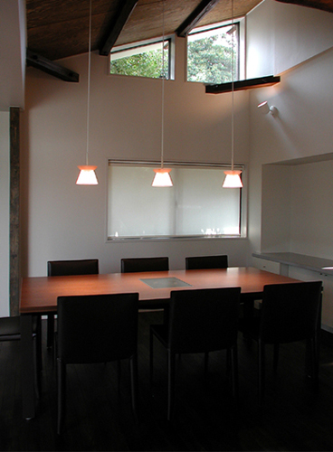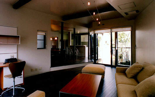 空間処理。@リビング、キッチンの視覚的つながりとして、コートとしてのデッキとその緑を考え、面する部分はオールガラスにしました。Aダイニング部は民家の天井をとって、小屋組みを見せた高い天井の空間として現出します。