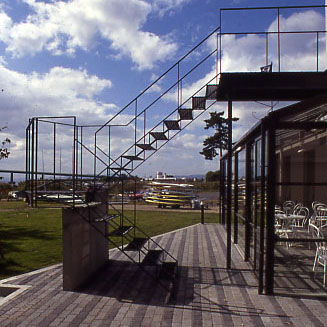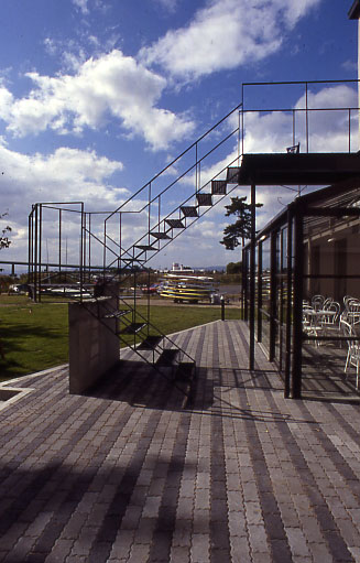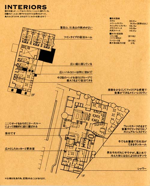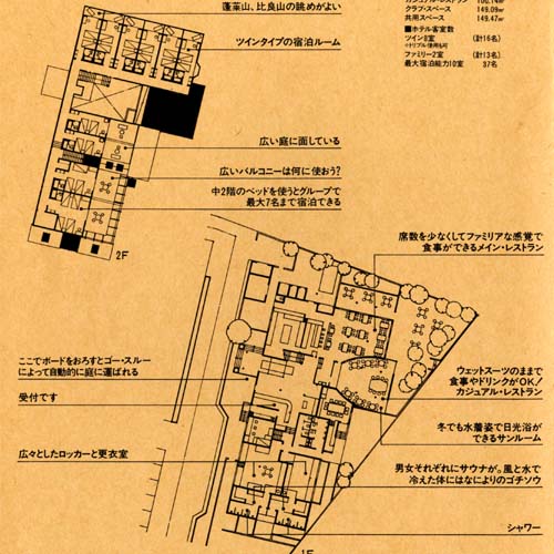 この施設がメンバーシップのクラブハウスであれ、遊びの基地であれ、リゾートという概念では、まず、宿泊可能なことが大きな意味をもつ。日帰りであそべるし、一週間そこで過ごすのもよい、どちらでも可能という時間に対するキャパシテイの自由なイメージが、「遊び」生活では特に必要なことのはずだから。そのうえで、琵琶湖の水面を利用することを中心にした、あらゆる「遊び」がめざされ、発見されていけばいいのではないか。ただ、利用者は、都会生活者であり、ライフスタイル、リビングスタイルなどの感性にフィットした空間が要求されることは言うまでもなく、マーケテイングコンセプトとしては、ヨット、ボートセーリングなどの遊びを、メンバーシップのなかで提供する空間とした。
